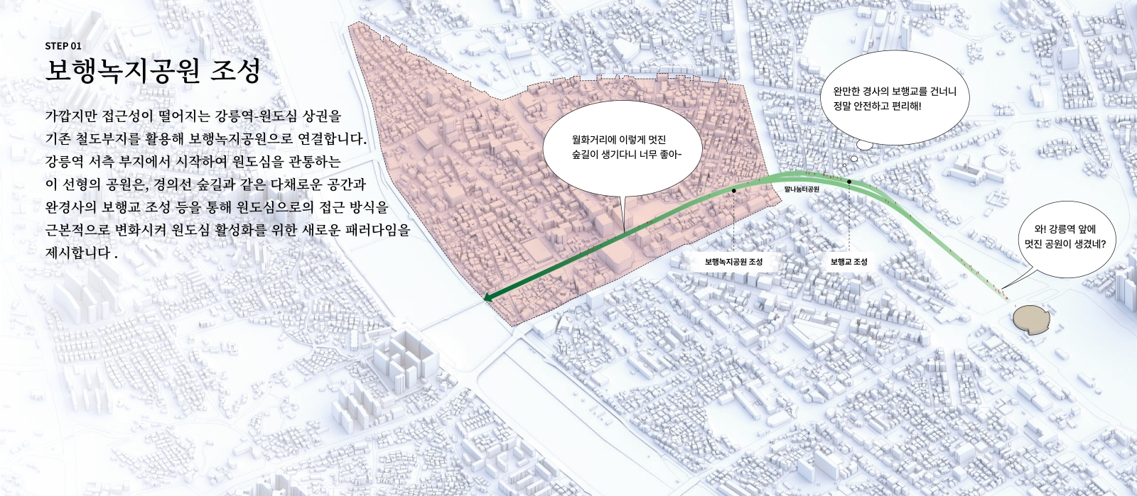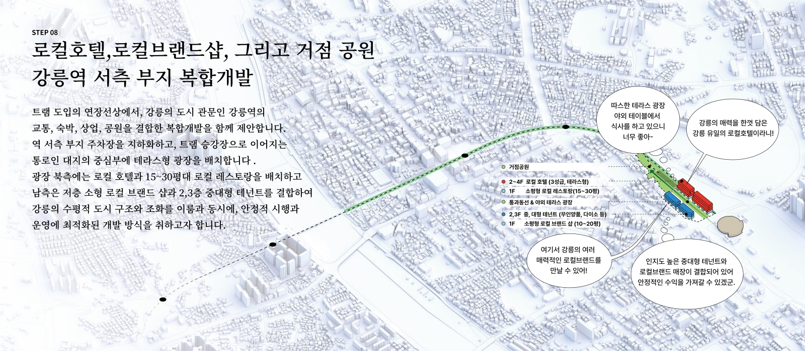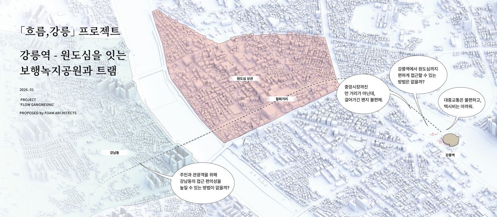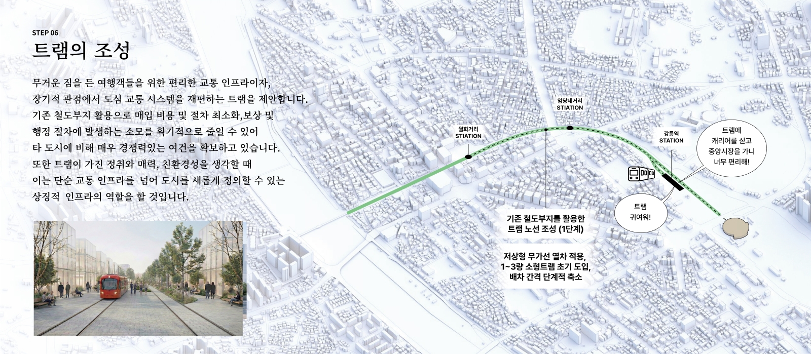제안의 계기는 현재 참여하고 있는 원도심 활성화를 위한 ‘감자시장’ 프로젝트와 그 안의 상권 브랜드이자 주민 거버넌스인 ‘감자타운’ 타우너로 활동하면서 생긴 원도심 활성화에 대한 관심과 바램으로부터 시작되었습니다. 지역 활성화를 위한 앵커시설 격인 감자시장의 역할과는 또 다른 도시 구조적 차원에서 원도심을 활성화할 수 있는 방안을 고민하여 장기적 관점에서 체계적인 제안을 만들어보고 싶었습니다. 이에 본 제안은 기존 철도부지인 월화거리 부지를 활용하여 강릉역에서부터 이어지는 보행녹지공원과 트램의 조성을 근간으로 합니다.더불어 이 제안에서 파생될 수 있는 도시 개발 및 변화의 가능성을 함께 제안하여,단순 교통 인프라 도입을 넘어선 도시의 근원적 변화에 대한 내용을 다루었습니다.