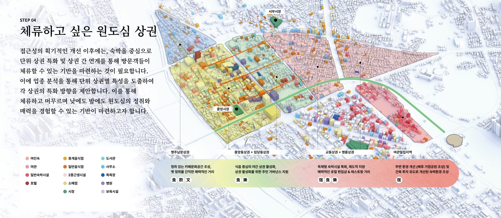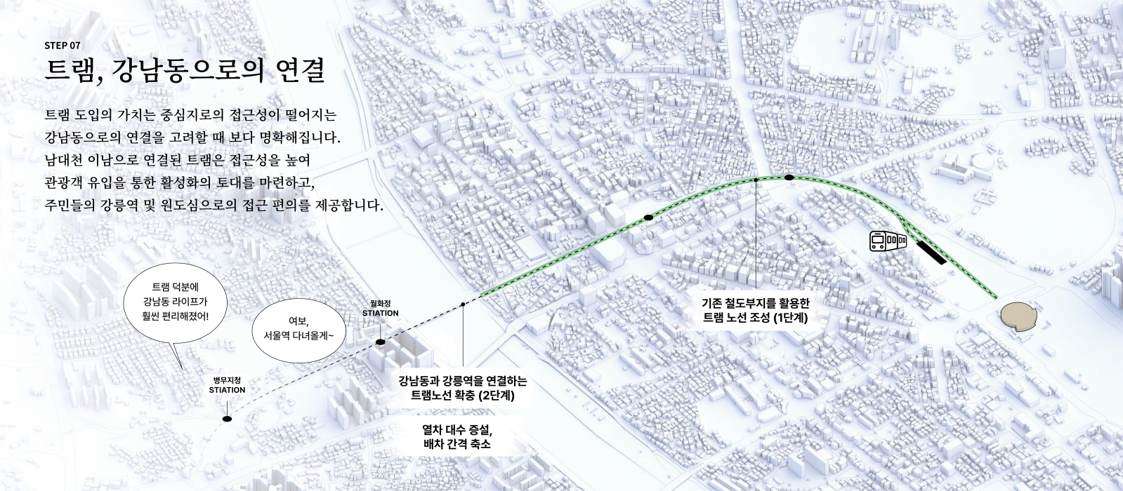 제안의 계기는 현재 참여하고 있는 원도심 활성화를 위한 ‘감자시장’ 프로젝트와 그 안의 상권 브랜드이자 주민 거버넌스인 ‘감자타운’ 타우너로 활동하면서 생긴 원도심 활성화에 대한 관심과 바램으로부터 시작되었습니다. 지역 활성화를 위한 앵커시설 격인 감자시장의 역할과는 또 다른 도시 구조적 차원에서 원도심을 활성화할 수 있는 방안을 고민하여 장기적 관점에서 체계적인 제안을 만들어보고 싶었습니다. 이에 본 제안은 기존 철도부지인 월화거리 부지를 활용하여 강릉역에서부터 이어지는 보행녹지공원과 트램의 조성을 근간으로 합니다.더불어 이 제안에서 파생될 수 있는 도시 개발 및 변화의 가능성을 함께 제안하여,단순 교통 인프라 도입을 넘어선 도시의 근원적 변화에 대한 내용을 다루었습니다.